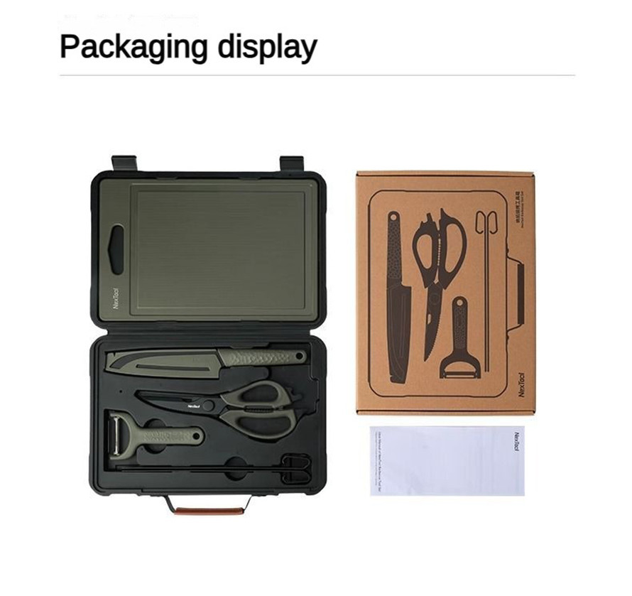 Product included: Storage Box, Paring Knife, Multifunction Scissors, Santoku Knife, Chopping Board, BBQ Tongs